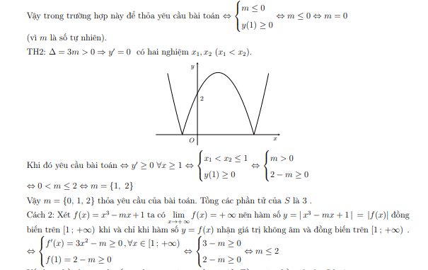 Cho hàm số y = |x3 − mx + 1|. Gọi S là tập tất cả các số tự nhiên m sao cho hàm số đồng biến trên [1; +∞). Tính tổng tất cả các phần tử của S.