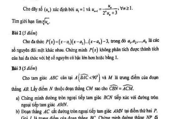 + Cho tam giác ABC cân tại A (góc BAC < 90°) và M là trung điểm của đoạn thẳng AB. Lấy điểm N thuộc đoạn thẳng CM sao cho CBN = ACM.