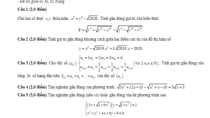Ngày 04 tháng 10 năm 2019, sở Giáo dục và Đào tạo Thừa Thiên Huế tổ chức kỳ thi chọn học sinh giỏi cấp tỉnh giải toán trên máy tính cầm tay năm học 2019 – 2020 dành cho học sinh khối 12.Đề chọn học sinh giỏi MTCT 12 năm 2019 – 2020 sở GD&ĐT Thừa Thiên Huế gồm 09 câu, thời gian làm bài 90 phút, thí sinh dự thi trình bày vắn tắt cách giải, công thức áp dụng.Trích dẫn đề chọn học sinh giỏi MTCT 12 năm 2019 – 2020 sở GD&ĐT Thừa Thiên Huế: