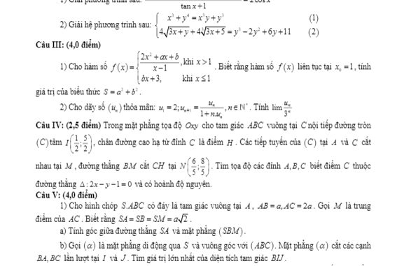 + Trong mặt phẳng tọa độ Oxy cho tam giác ABC vuông tại C nội tiếp đường tròn (C) tâm I(1/2;5/2), chân đường cao hạ từ đỉnh C là điểm H. Các tiếp tuyến của (C) tại A và C cắt nhau tại M, đường thẳng BM cắt CH tại N(6/5;8/5). Tìm tọa độ các đỉnh A, B, C biết điểm C thuộc đường thẳng delta: 2x – y – 1 = 0 và có hoành độ nguyên.