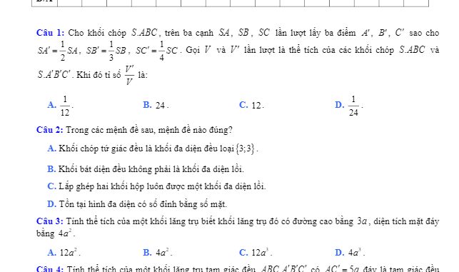 Nhằm đáp ứng yêu cầu kiểm tra tổng kết chủ đề khối đa diện và thể tích của chúng, tổ chuyên môn Toán – Tin trường THPT Bình Sơn – Vĩnh Phúc tổ chức kiểm tra 1 tiết Hình học 12 chương 1 năm học 2019 – 2020.Đề kiểm tra 1 tiết Hình học 12 chương 1 năm 2019 – 2020 trường Bình Sơn – Vĩnh Phúc mã đề 132 gồm có 04 trang, đề được biên soạn theo dạng đề trắc nghiệm khách quan với 25 câu hỏi và bài toán, học sinh làm bài kiểm tra trong khoảng thời gian 45 phút, đề kiểm tra có đáp án.Trích dẫn đề kiểm tra 1 tiết Hình học 12 chương 1 năm 2019 – 2020 trường Bình Sơn – Vĩnh Phúc: