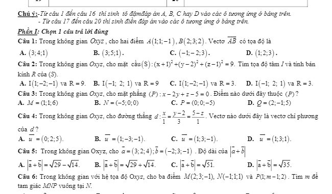 Đề kiểm tra 1 tiết Hình học 12 chương 3 năm học 2018 – 2019 trường THPT Thị xã Quảng Trị có mã đề 135, nội dung kiểm tra thuộc chủ đề phương pháp tọa độ trong không gian Oxyz, đề gồm 2 trang được biên soạn theo dạng trắc nghiệm chọn đáp án đúng kết hợp với trắc nghiệm điền khuyết, phần trắc nghiệm chọn đáp án đúng gồm 16 câu, phần trắc nghiệm điền khuyết gồm 4 câu, mục đích nhằm loại bỏ yếu tố may mắn đối với các câu hỏi và bài toán vận dụng cao, giúp cho việc phân loại học sinh chính xác hơn, đề kiểm tra có đáp án.Trích dẫn đề kiểm tra 1 tiết Hình học 12 chương 3 năm 2018 – 2019 trường Thị xã Quảng Trị: