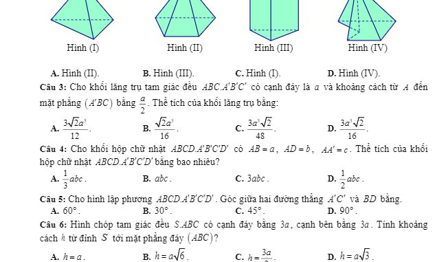 + Khối lăng trụ ABC.A’B’C’ có thể tích bằng 6. Mặt phẳng (A’B’C’) chia khối lăng trụ thành một khối chóp tam giác và một khối chóp tứ giác có thể tích lần lượt là?