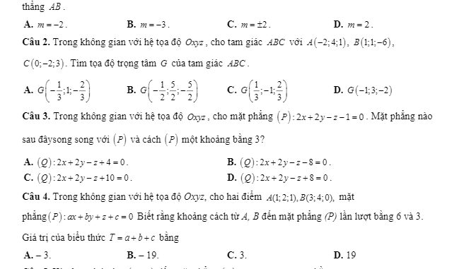 + Trong không gian với hệ tọa độ Oxyz, cho A(1;2;3), B(3;4;4). Tìm tất cả các giá trị của tham số m sao cho khoảng cách từ điểm A đến mặt phẳng 2x + y + mz – 1 = 0 bằng độ dài đoạn thẳng AB.