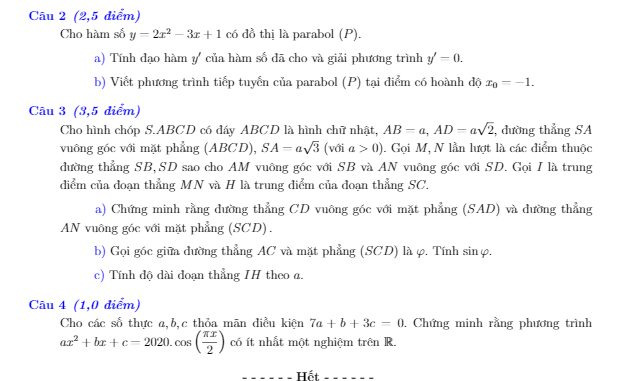 + Cho hình chóp S.ABCD có đáy ABCD là hình chữ nhật, AB = a, AD = a√2, đường thẳng SA vuông góc với mặt phẳng (ABCD), SA = a√3 (với a > 0). Gọi M, N lần lượt là các điểm thuộc đường thẳng SB, SD sao cho AM vuông góc với SB và AN vuông góc với SD. Gọi I là trung điểm của đoạn thẳng MN và H là trung điểm của đoạn thẳng SC.