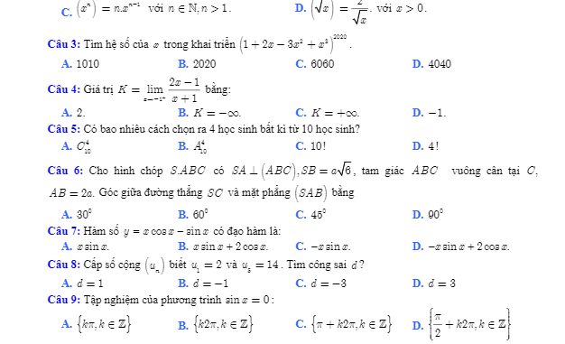 Đề kiểm tra chất lượng Toán 11 lần 2 năm 2019 – 2020 trường THPT Lý Thái Tổ – Bắc Ninh