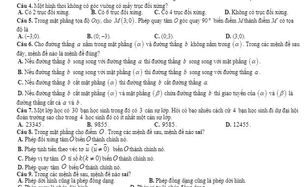 C. Phép đối xứng tâm O biến d thành đường thẳng d’ song song hoặc trùng với d. D. Phép vị tự tâm O tỉ số k (k ≠ 0) biến d thành đường thẳng d’ song song hoặc trùng với d.