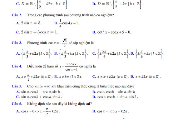 Đề KSCL đầu năm Toán 11 năm 2020 – 2021 trường Yên Phong 2 – Bắc Ninh