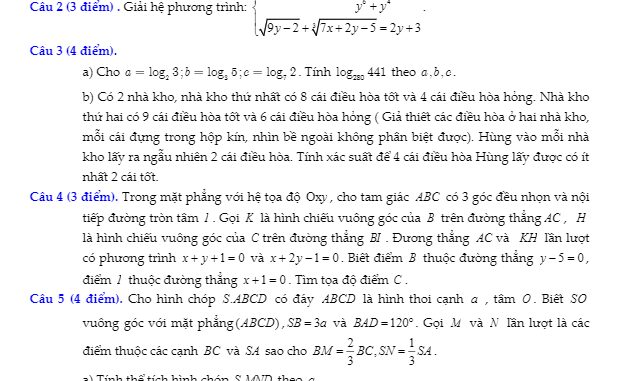 + Trong mặt phẳng với hệ tọa độ Oxy, cho tam giác ABC có 3 góc đều nhọn và nội tiếp trong đường tròn tâm I. Gọi K là hình chiếu vuông góc của B trên đường thẳng AC, H là hình chiếu vuông góc của C trên đường thẳng BI. Đường thẳng AC và KH lần lượt có phương trình là x + y + 1 = 0 và x + 2y – 1 = 0. Biết điểm B thuộc đường thẳng y – 5 = 0, điểm I thuộc đường thẳng x + 1 = 0. Tìm tọa độ điểm C.