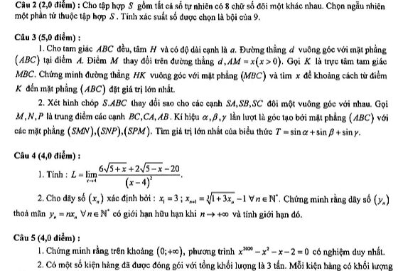 + Cho tam giác ABC đều, tâm H và có độ dài cạnh là a. Đường thẳng d vuông góc với mặt phẳng (ABC) tại điểm A. Điểm M thay đổi trên đường thẳng d, AM = x (x > 0). Gọi K là trực tâm tam giác MBC. Chứng minh đường thẳng HK vuông góc với mặt phẳng (MBC) và tìm x để khoảng cách từ điểm K đến mặt phẳng (ABC) đạt giá trị lớn nhất.