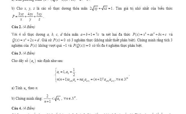 + Với 4 số thực dương a, b, c, d thỏa mãn a + b + 1 = 7c ta xét hai đa thức P(x) = x^3 + ax^2 + bx + c và Q(x) = x^2 + 2x + d. Giả sử P(x) = 0 có 3 nghiệm thực (không nhất thiết phân biệt). Chứng minh rằng tích 3 nghiệm của P(x) không vượt quá -1 và P(Q(x)) = 0 có tối đa 4 nghiệm thực phân biệt.
