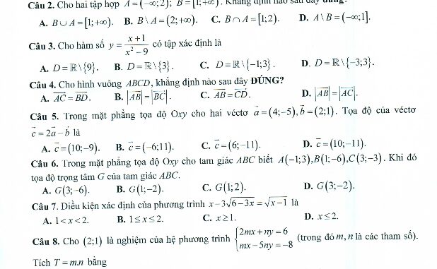 Ngày … tháng 12 năm 2019, sở Giáo dục và Đào tạo tỉnh Bà Rịa – Vũng Tàu tổ chức kì thi kiểm tra học kì 1 môn Toán lớp 10 (khối THPT và khối GDTX) năm học 2019 – 2020.Đề thi HK1 Toán 10 năm học 2019 – 2020 sở GD&ĐT Bà Rịa – Vũng Tàu mã đề 01 gồm có 03 trang, đề được biên soạn theo dạng trắc nghiệm khách quan kết hợp với tự luận, trong đó: phần trắc nghiệm gồm có 15 câu, chiếm 3,0 điểm, học sinh làm bài trong 30 phút; phần tự luận gồm có 5 câu, chiếm 7,0 điểm, học sinh làm bài trong 60 phút; đề thi có đáp án và lời giải chi tiết các mã đề: 01, 02, 03, 04.Trích dẫn đề thi HK1 Toán 10 năm học 2019 – 2020 sở GD&ĐT Bà Rịa – Vũng Tàu: