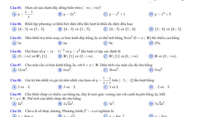 Sáng thứ Năm ngày 19 tháng 12 năm 2019, sở Giáo dục và Đào tạo tỉnh Đồng Nai tổ chức kỳ thi kiểm tra học kỳ 1 môn Toán 12 năm học 2019 – 2020 dành cho đối tượng học sinh lớp 12 hệ THPT và GDTX.Đề thi HK1 Toán 12 năm học 2019 – 2020 sở GD&ĐT Đồng Nai gồm có 04 mã đề: 01, 02, 03, 04; đề thi có 04 trang với 50 câu hỏi và bài toán dạng trắc nghiệm, học sinh làm bài thi trong khoảng thời gian 90 phút.Trích dẫn đề thi HK1 Toán 12 năm học 2019 – 2020 sở GD&ĐT Đồng Nai: