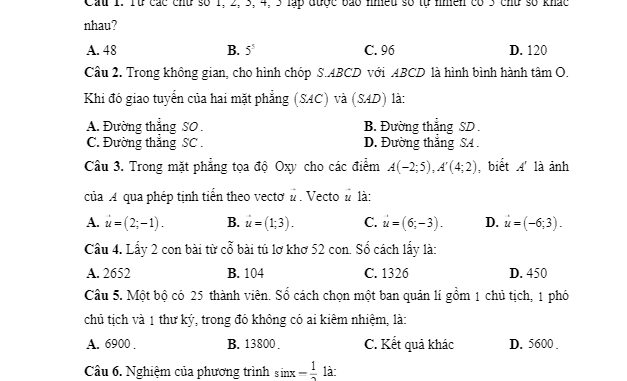 + Một bộ có 25 thành viên. Số cách chọn một ban quản lí gồm 1 chủ tịch, 1 phó chủ tịch và 1 thư ký, trong đó không có ai kiêm nhiệm, là: