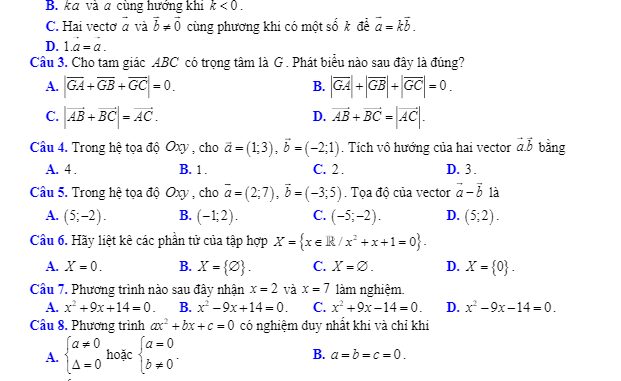 C. Hai vectơ a và b khác 0 cùng phương khi có một số k để a = kb. D. 1.a = a.