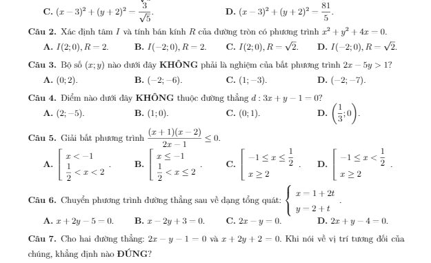 + Cho hai đường thẳng: 2x − y − 1 = 0 và x + 2y + 2 = 0. Khi nói về vị trí tương đối của chúng, khẳng định nào ĐÚNG?