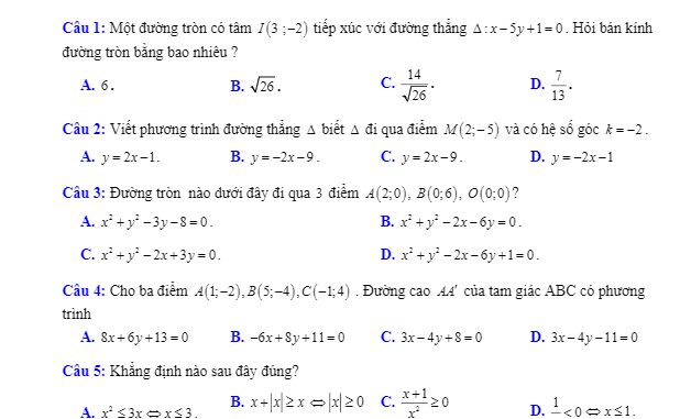 Đề thi học kỳ 2 Toán 10 năm 2019 – 2020 trường THPT Hưng Nhân – Thái Bình