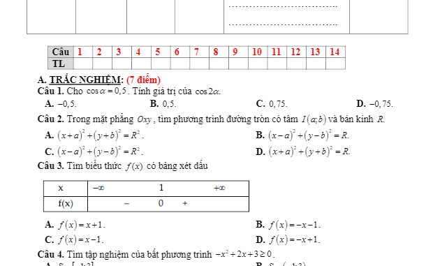 Nhằm tổng kết chất lượng học tập môn Toán của học sinh khối lớp 10, vừa qua, trường THPT Lương Văn Cù, huyện Chợ Mới, tỉnh An Giang tổ chức kỳ thi học kỳ 2 Toán 10 năm học 2019 – 2020.Đề thi học kỳ 2 Toán 10 năm 2019 – 2020 trường THPT Lương Văn Cù – An Giang mã đề 456 gồm 02 trang với 14 câu trắc nghiệm và 03 câu tự luận, thời gian làm bài 60 phút.Trích dẫn đề thi học kỳ 2 Toán 10 năm 2019 – 2020 trường THPT Lương Văn Cù – An Giang: