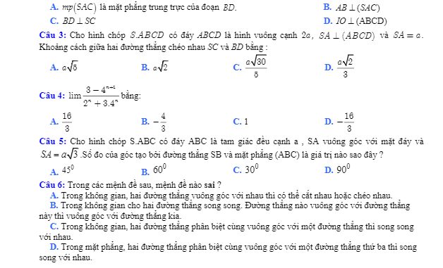 + Cho hình chóp S.ABCD có đáy ABCD là hình vuông tâm O, SA vuông góc với mặt phẳng (ABCD). Gọi I là trung điểm SC. Chọn khẳng định sai: