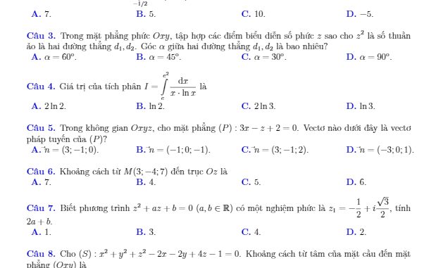 + Trong mặt phẳng phức Oxy, tập hợp các điểm biểu diễn số phức z sao cho z2 là số thuần ảo là hai đường thẳng d1, d2. Góc α giữa hai đường thẳng d1, d2 là bao nhiêu?