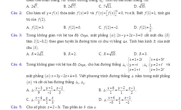 Ngày … tháng 06 năm 2020, trường THPT chuyên Quốc học Huế, tỉnh Thừa Thiên Huế tổ chức kỳ thi kiểm tra chất lượng học kỳ 2 (HK2) môn Toán lớp 12 năm học 2019 – 2020.Đề thi học kỳ 2 Toán 12 năm 2019 – 2020 trường THPT chuyên Quốc học Huế gồm 04 trang với 32 câu trắc nghiệm và 02 câu tự luận, thời gian làm bài 90 phút.Trích dẫn đề thi học kỳ 2 Toán 12 năm 2019 – 2020 trường THPT chuyên Quốc học Huế:
