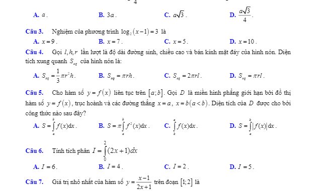 + Cho hàm số y = f(x) liên tục trên [a;b]. Gọi D là miền hình phẳng giới hạn bởi đồ thị hàm số y = f(x), trục hoành và các đường thẳng x = a, x = b (a < b). Diện tích của D được cho bởi công thức nào sau đây?