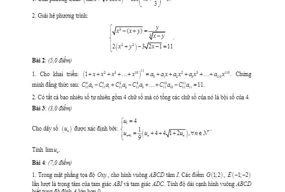 + Trong mặt phẳng tọa độ Oxy, cho hình vuông ABCD tâm I. Các điểm G(1;2), E(-1;-2) lần lượt là trọng tâm của tam giác ABI và tam giác ADC. Tính độ dài cạnh hình vuông ABCD biết tung độ đỉnh A lớn hơn 0.