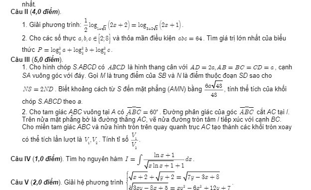 + Cho hình chóp S.ABCD có ABCD là hình thang cân với AD = 2a, AB = BC = CD = a, cạnh SA vuông góc với đáy. Gọi M là trung điểm của SB và N là điểm thuộc đoạn SD sao cho NS = 2ND. Biết khoảng cách từ S đến mặt phẳng (AMN) bằng 6a√43/43, tính thể tích của khối chóp S.ABCD theo a.