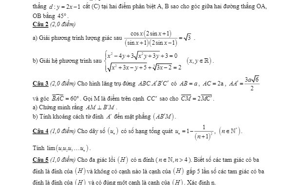 + Cho hàm số y = (mx – m + 2)/(x + 1) có đồ thị là (C). Tìm tất cả các giá trị của tham số m để đường thẳng d: y = 2x – 1 cắt (C) tại hai điểm phân biệt A, B sao cho góc giữa hai đường thẳng OA, OB bằng 45 độ.