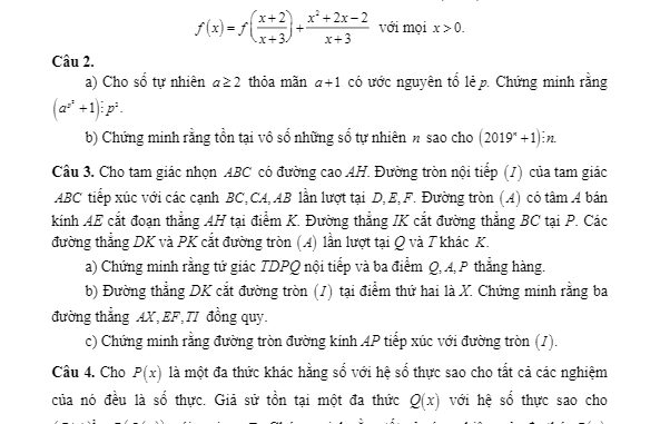 + Cho tam giác nhọn ABC có đường cao AH. Đường tròn nội tiếp (I) của tam giác ABC tiếp xúc với các cạnh BC, CA, AB lần lượt tại D, E, F. Đường tròn (A) có tâm A bán kính AE cắt đoạn thẳng AH tại điểm K. Đường thẳng IK cắt đường thẳng BC tại P. Các đường thẳng DK và PK cắt đường tròn (A) lần lượt tại Q và T khác K.